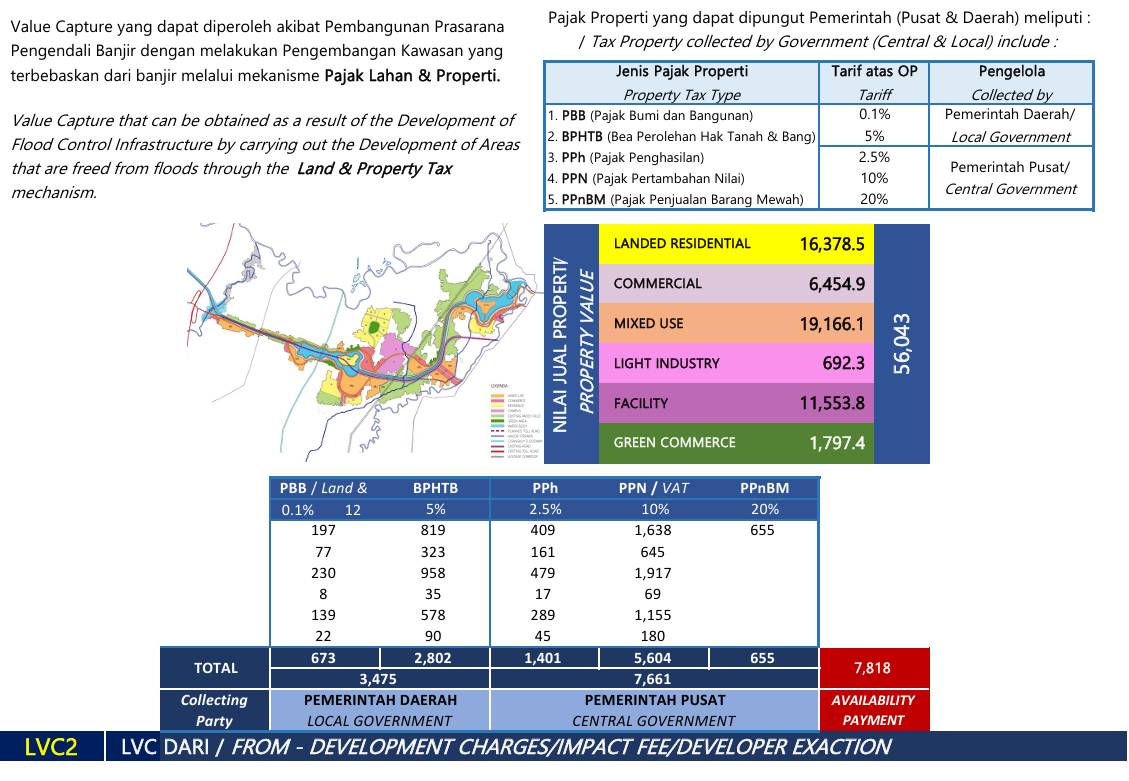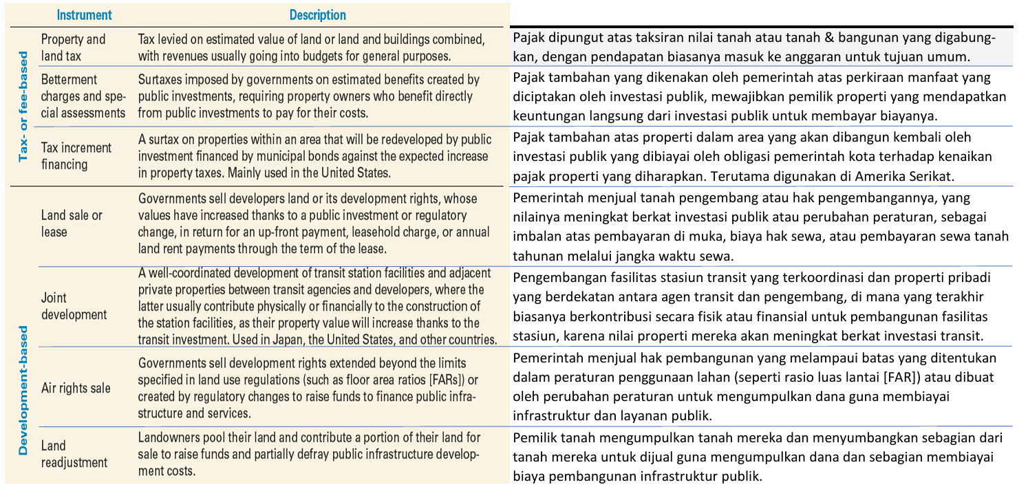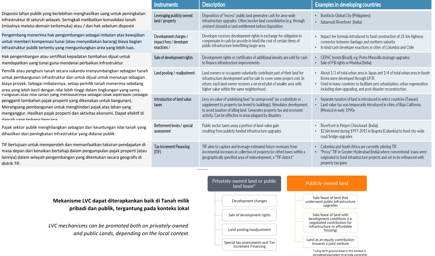 Terdapat 2 kategori LVC, yaitu (1) LVC berbasis pajak dan atau retribusi (tax or fee based), dan (2) berbasis pembangunan (development based), seperti yang dijelaskan secara lebih rinci pada tabel berikut :